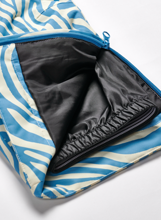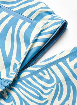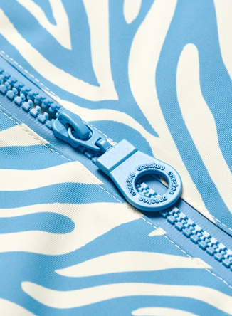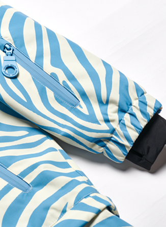 For the wild ones, this new snow suit design in blue zebra print is fiercely unique. It’s made from our robust SnowSense outer shell fabric and boasts a range of technical features: