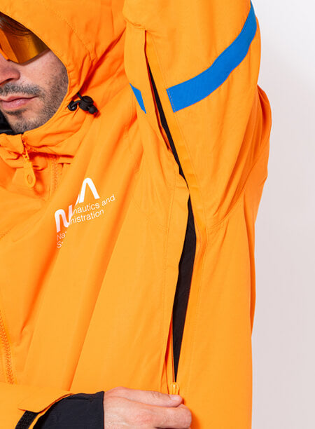 Our NASA space (snow) suit has become one of our most popular designs and a staple within our men's collections - this is the striking orange & blue colour way.