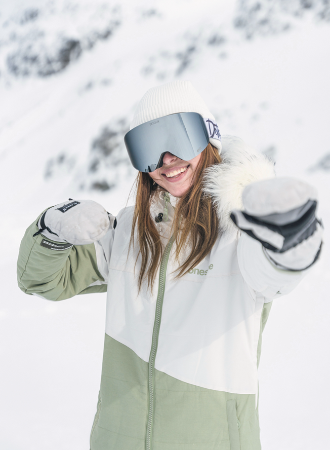 This on-trend design in soothing sage green and white has a diagonal split panel and features a detachable faux fur hood trim. It’s part of our 2-in-1 Acclimate™ range which features a 360° zip around the waist that transforms the Oneskee suit into a jacket in seconds, allowing you to use it independently during apres and the milder months. It’s made from our robust SnowSense outer shell fabric and the following technical features:
